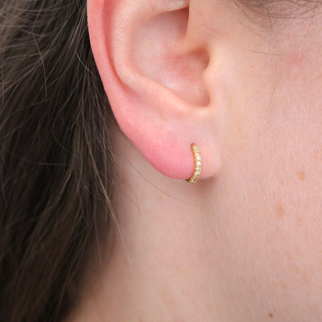 The Diamond Huggies are perfect for anyone seeking a versatile yet sophisticated pair of hoops, offering a subtle sparkle that elevates both casual and formal outfits.