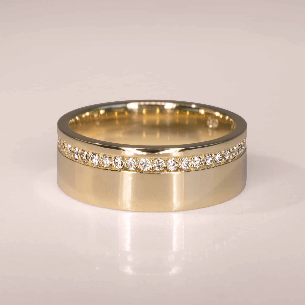 Elevate your jewellery collection with The Pavé Cigare Band, a stunning piece of craftsmanship designed to exude elegance and modern luxury. This bold 7mm band, set in 9k Yellow Gold, features approximately 45 x 0.45ctw I/J VS-SI Natural Round Brilliant Diamonds that shimmer with every movement. The combination of a sleek, polished surface and the intricate diamond detailing creates a perfect balance of refinement and sparkle.