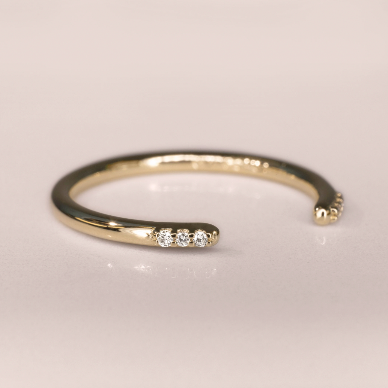 The Saint Tropez ring pairs beautifully with any solitaire or stackable ring, offering a sleek, modern edge to your jewellery collection. Its open-ended design is embellished with six dazzling stones, giving a touch of understated glamour. Choose from 9k Yellow Gold, White Gold, or Rose Gold to perfectly complement your personal style.