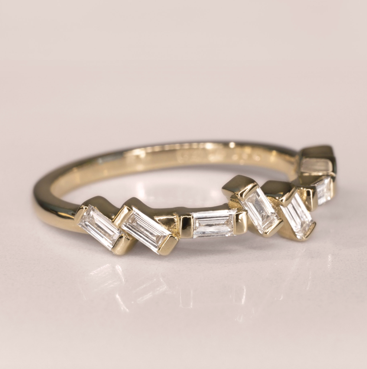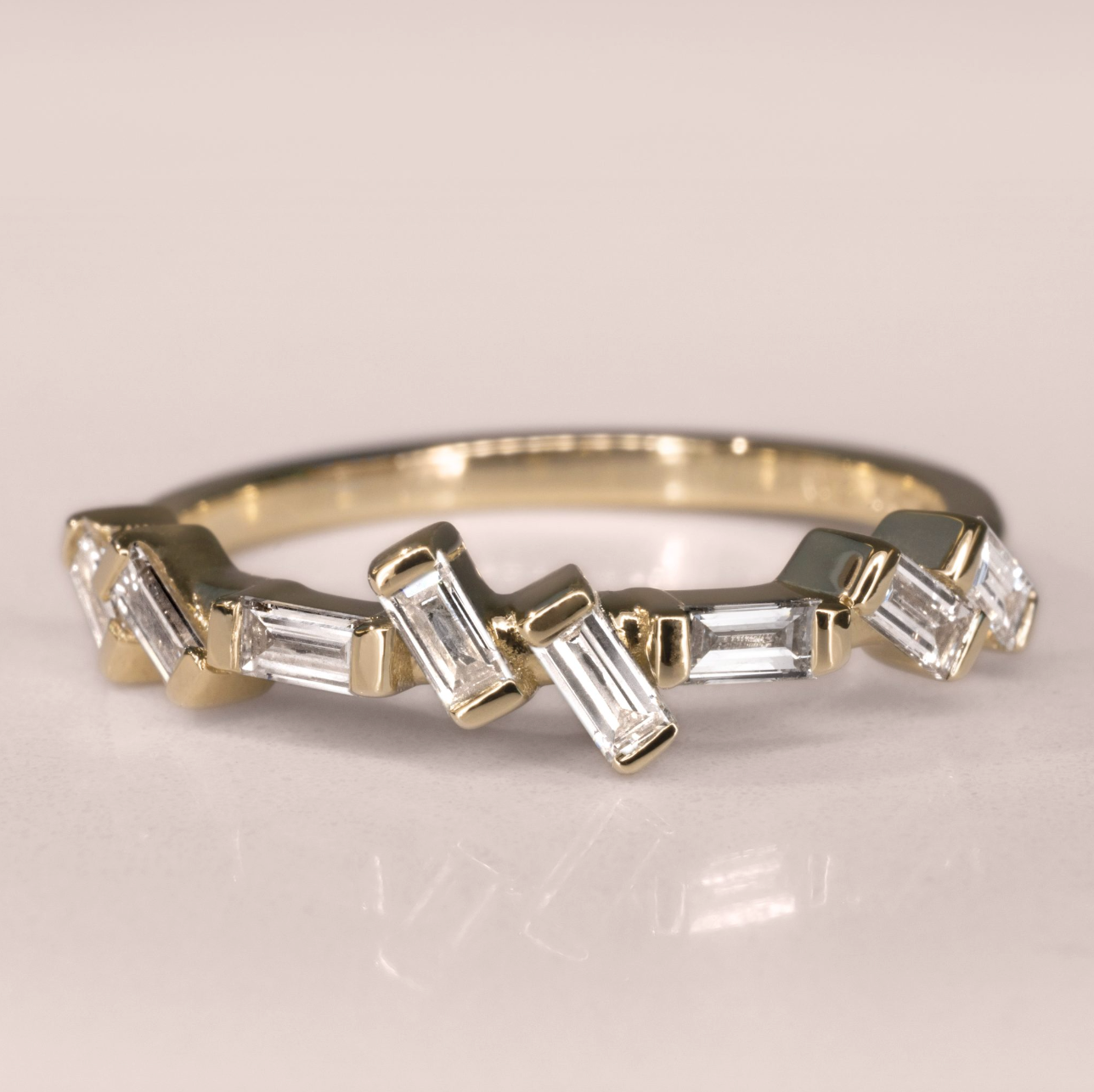 The Daybreak is a modern take on classic elegance, crafted in 9k yellow gold and set with baguette cut lab-grown diamonds. Each stone is angled with intention, creating a playful sense of movement and a soft shimmer as it catches the light. Whether worn alone or stacked with your favourite bands, this piece brings a refined edge to any look. Ethically crafted and consciously designed, The Daybreak is a timeless addition to any collection.