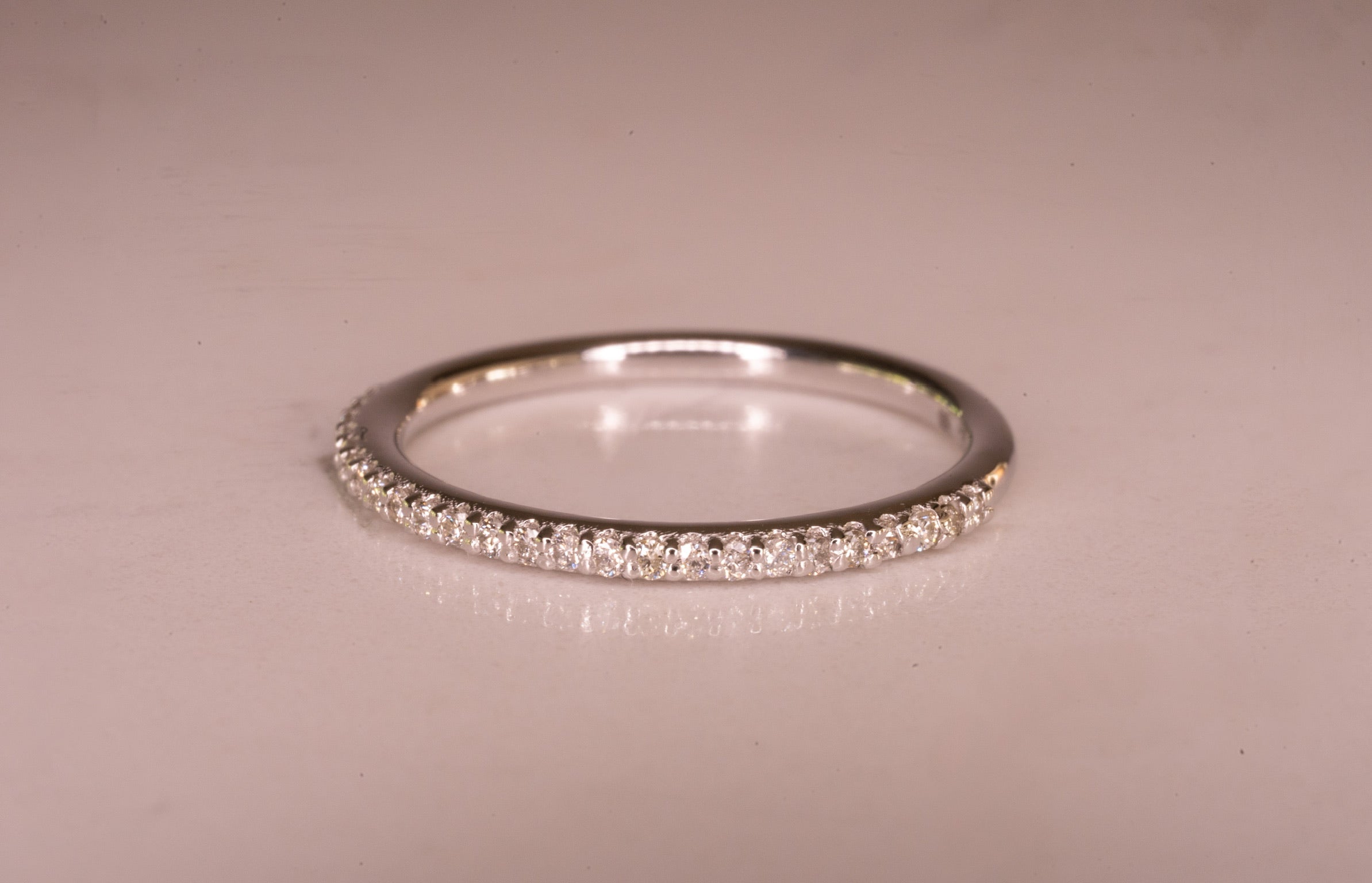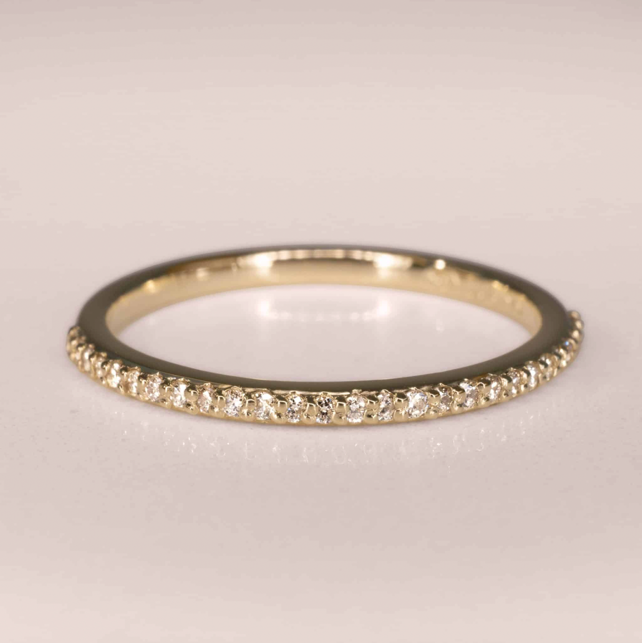 Crafted from luxurious 9k gold, The Parisian Ring exudes timeless elegance with its delicate band adorned with between 25 to 33 round brilliant-cut IJ natural diamonds, depending on the ring size. The total diamond weight ranges between 0.125ctw to 0.165ctw, offering a refined sparkle that complements any outfit, whether for everyday wear or special occasions.