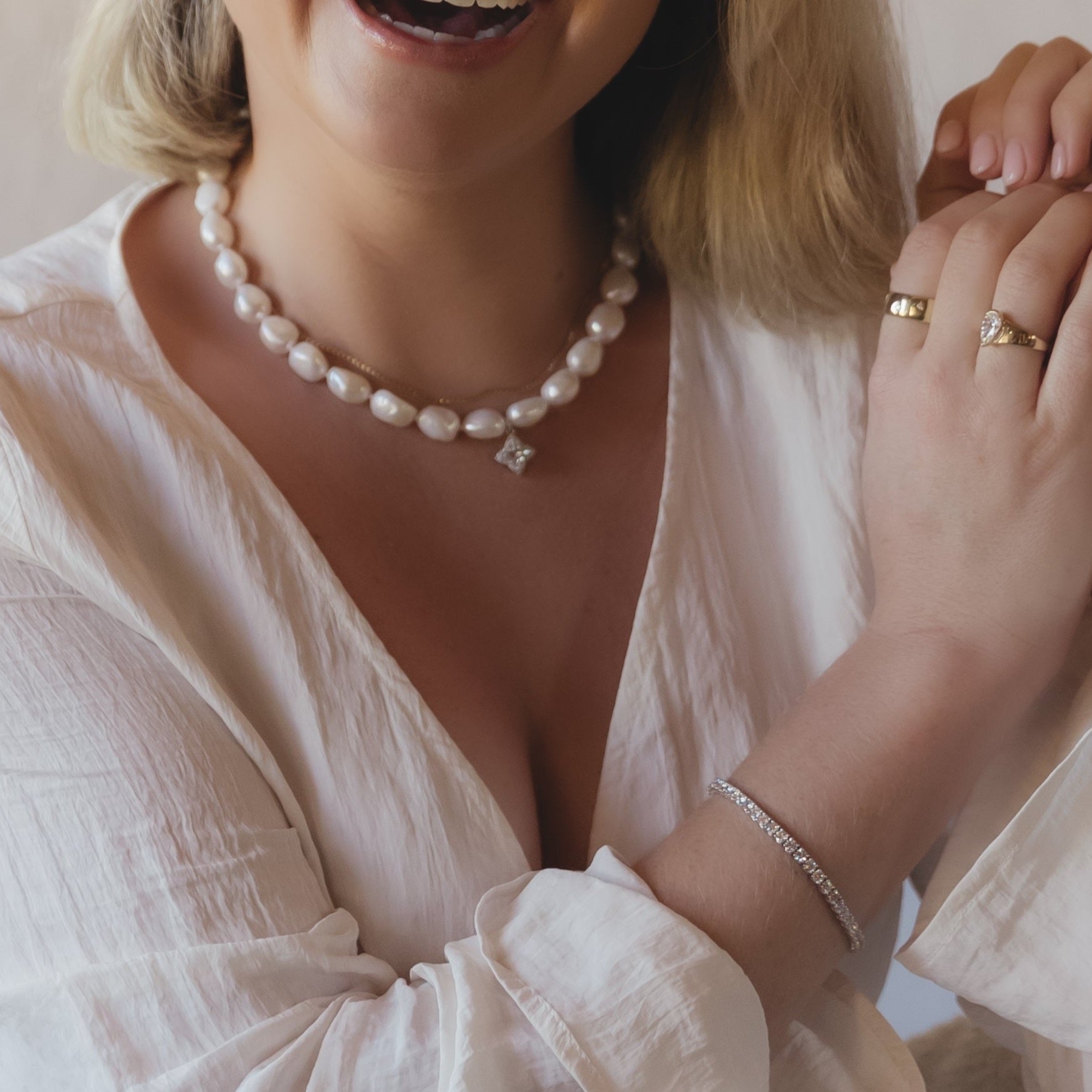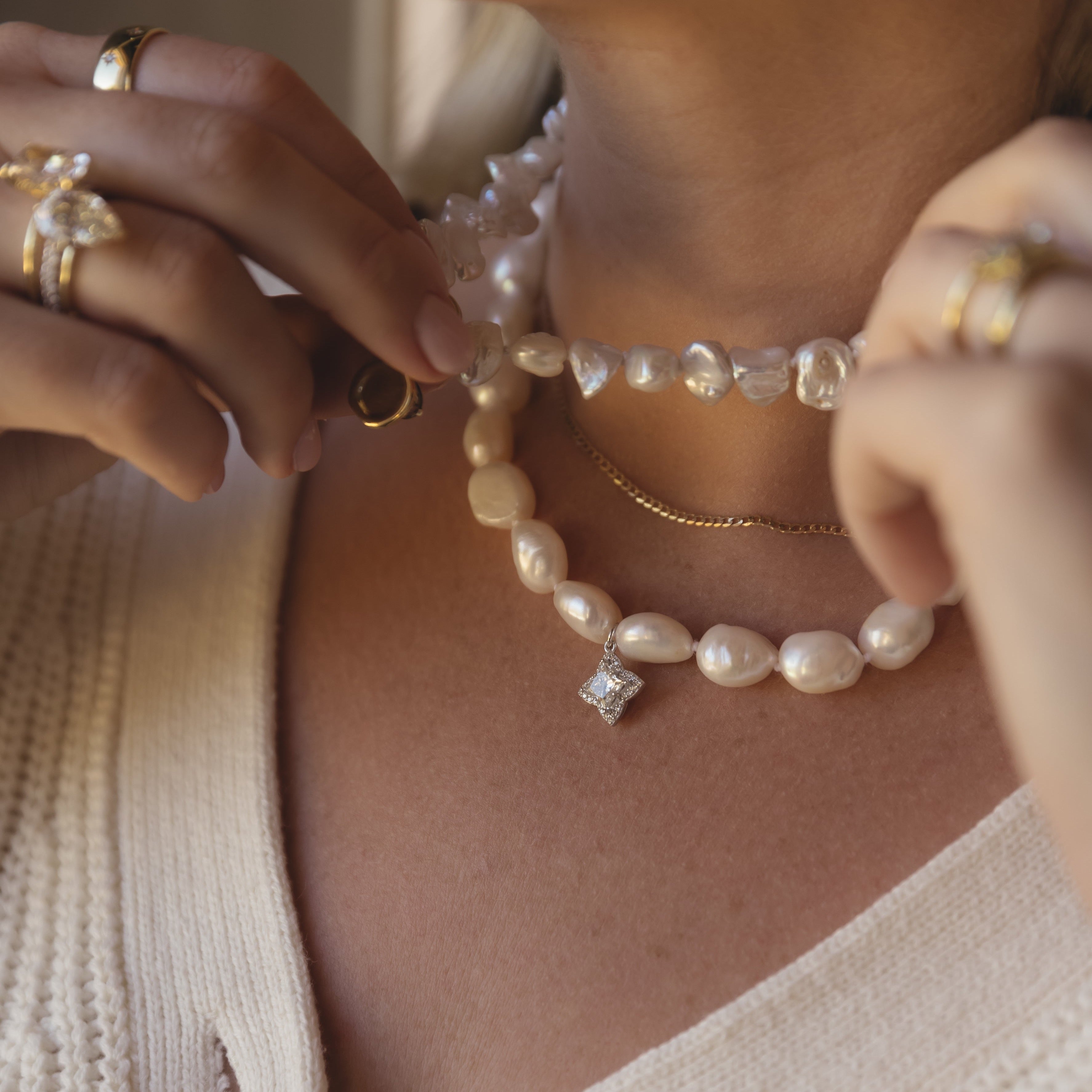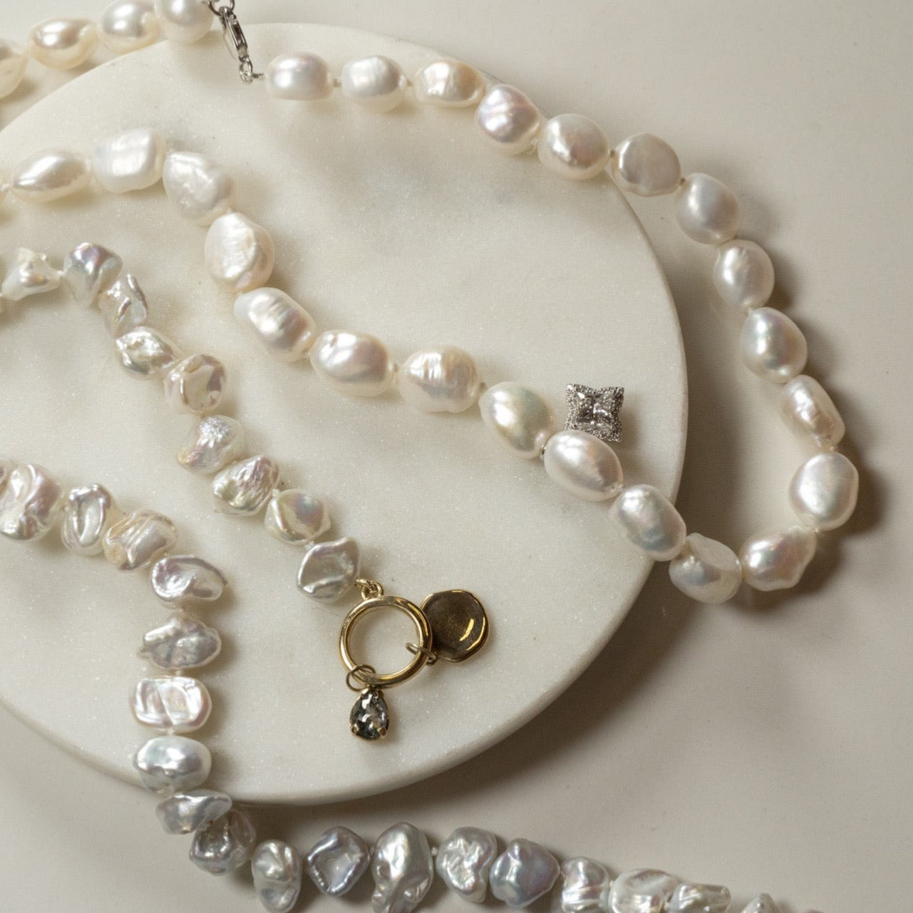 The Pearl Necklace with Floral Diamond Pendant is a timeless masterpiece that exudes elegance and sophistication. This exquisite necklace features radiant natural pearls, each meticulously hand-selected for their luminous shine and impeccable quality, making it a true celebration of classic beauty. At its centre lies a stunning floral-inspired pendant, showcasing a 1.07ct G VVS2 lab-grown diamond set in 9k white gold. This luxurious focal point adds an irresistible sparkle, capturing the perfect balance between nature's beauty and refined craftsmanship.