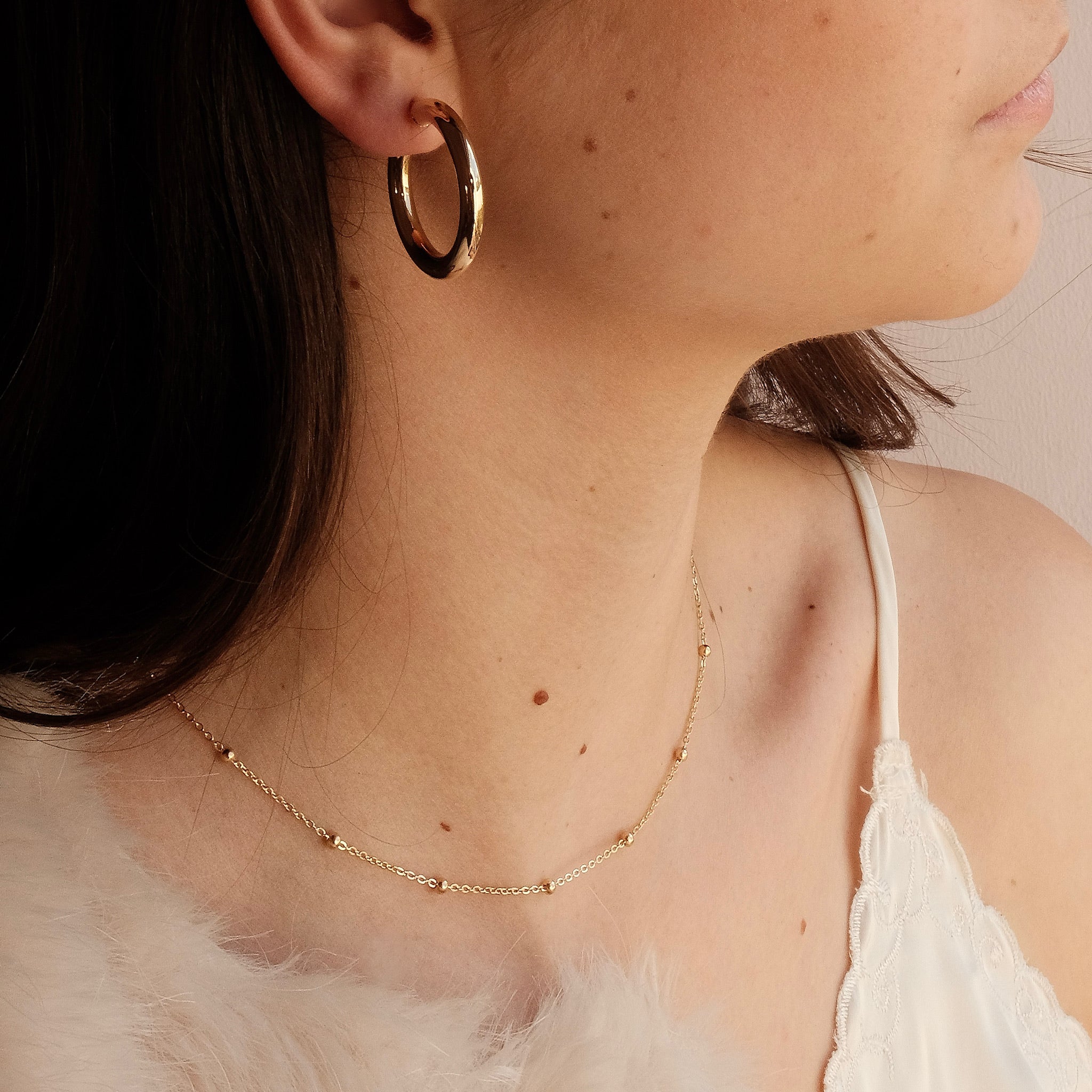 This elegant necklace, The Dreamer, is crafted in 9k Gold and is available in both Yellow Gold and Rose Gold. Its delicate design is highlighted by dainty gold beads spaced evenly along the chain, offering a touch of sophistication to any outfit. Available in multiple lengths, including 40cm, 45cm, 50cm, 60cm, and 120cm, you can choose the perfect fit for your style. Ideal for layering or as a subtle stand-alone piece, this necklace is a versatile addition to your collection.