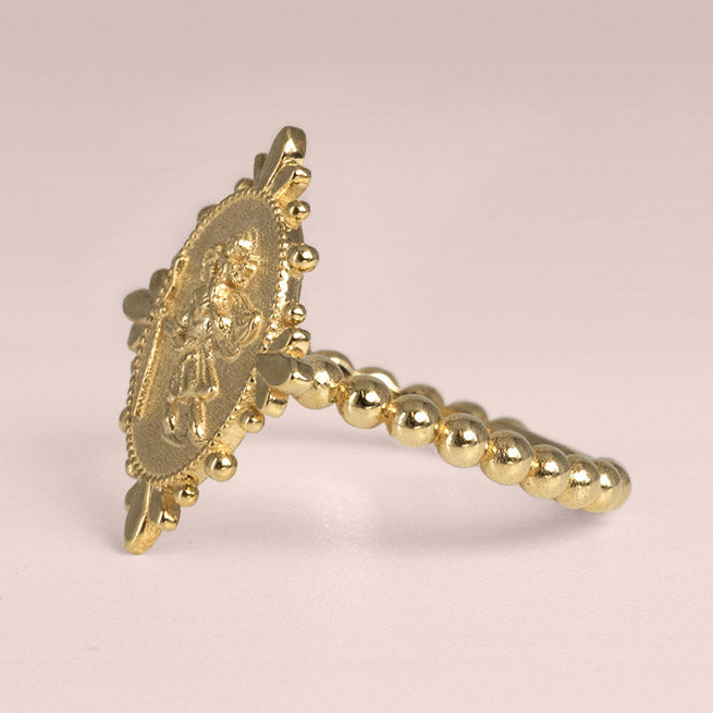 Crafted in solid 9k yellow gold, this vintage-inspired piece features an intricately framed oval medallion, engraved with St. Christopher as a symbol of guidance and safe passage. The delicate band is subtly textured for a poetic contrast, soft yet strong like the verses it’s named for.