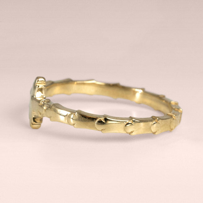 Delicate and defiant, the Liefde, Laat Ring is a quiet ode to late love, aching tenderness, and the thorny beauty of devotion. Crafted in 9k yellow gold, its band features softly sculpted thorns that encircle the finger. A symbol of how love, though gentle, can still leave its mark.