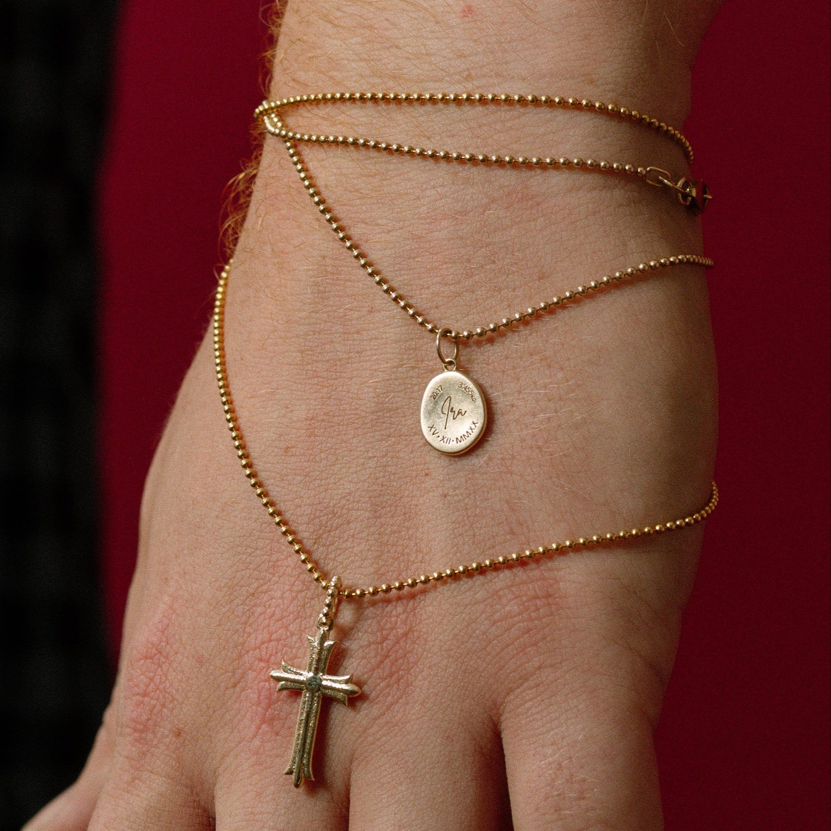 A soft rhythm in gold. The Klank Chain features rounded 9k gold beads in a seamless formation creating a minimalist melody of light and form. Designed for everyday wear and meaningful layering, this piece feels both nostalgic and modern, like the quiet hum of a memory.